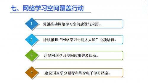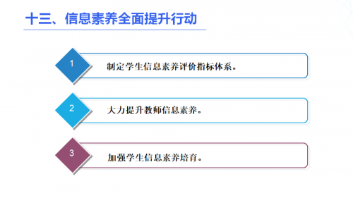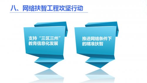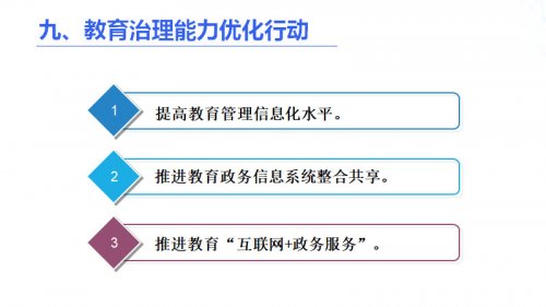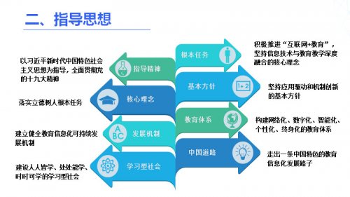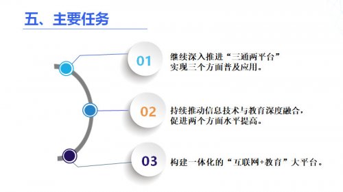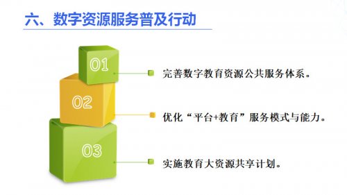 1.“三通”提效增质、两平台融合发展。三通包括“宽带网络校校通”、“优质资源班班通”、“网络学习空间人人通”。两平台包括教育资源公共服务平台和教育管理公共服务平台。