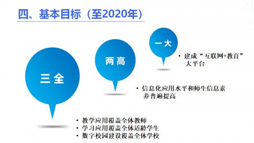 其中,“三全”指教学应用覆盖全体教师、学习应用覆盖全体适龄学生、数字校园建设覆盖全体学校;“两高”指信息化应用水平和师生信息素养普遍提高;一大指建成“互联网+教育”大平台。教育信息化从1.0时代进入2.0时代。