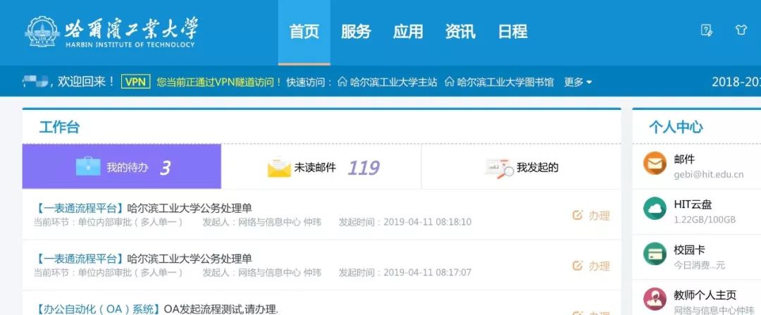 经过一次校园统一身份认证后进入校园门户主页。此状态下校园门户会显示“VPN”标识。