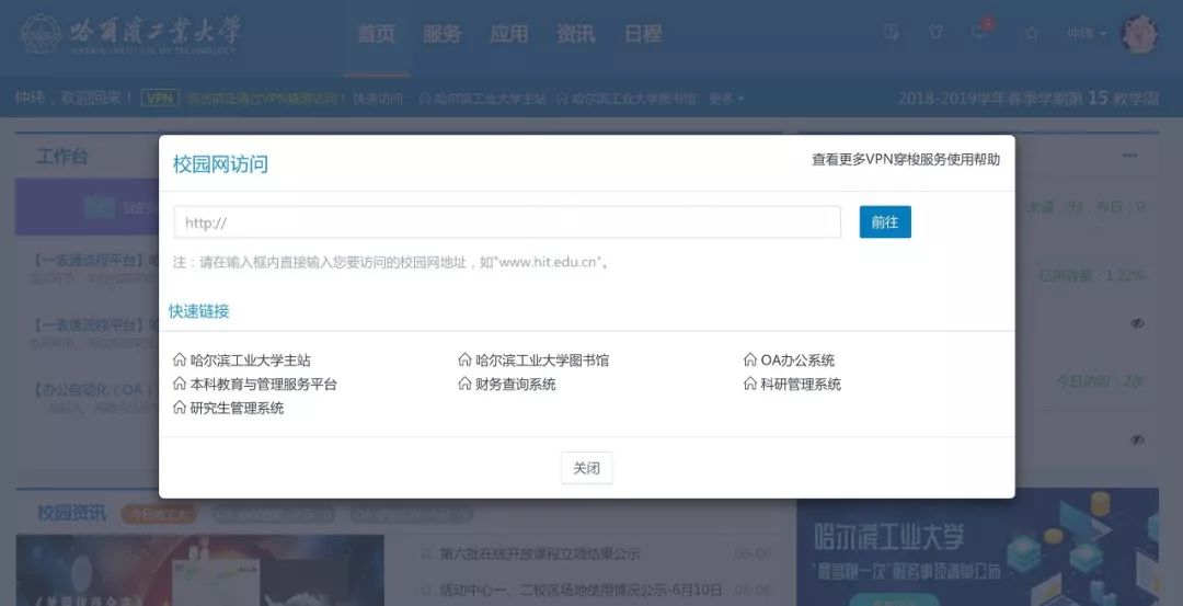 如果你现在正使用4G环境或是身处公网,则现在就可以尝试在浏览器输入http://ivpn.hit.edu.cn或点击下面的链接,体验在公网访问校园门户啦。