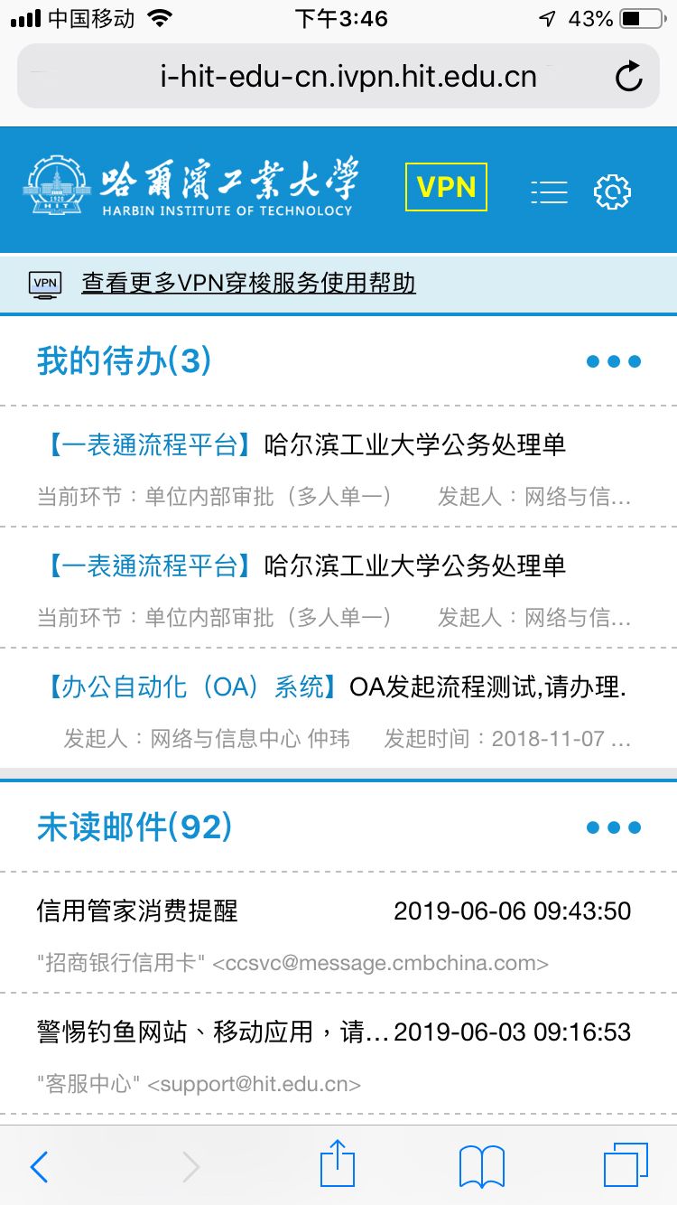 在移动端,师生也可以通过在移动设备浏览器直接输入http://ivpn.hit.edu.cn经校园认证后访问校园门户。此时通过校园门户跳转的任何校内地址均可正常访问。通过移动浏览器处理待办也很方便。