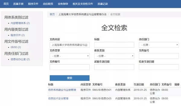 为使师生快捷有效的查询文件, 用户可利用本系统“全站检索”功能。借助Apache Solr,实现对质量管理文件的责任部门、文件类型、文件编号、体系类别等信息进行检索;另外,采用 Tika 实现对文本内容的搜索。