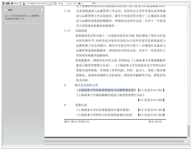 系统按照六个质量管理文件类型,及质量手册、程序文件、业务指导、相关支持性文件、质量记录作出相关的页面供检索查询;普通用户对文件内容不能进行复制、下载、打印。