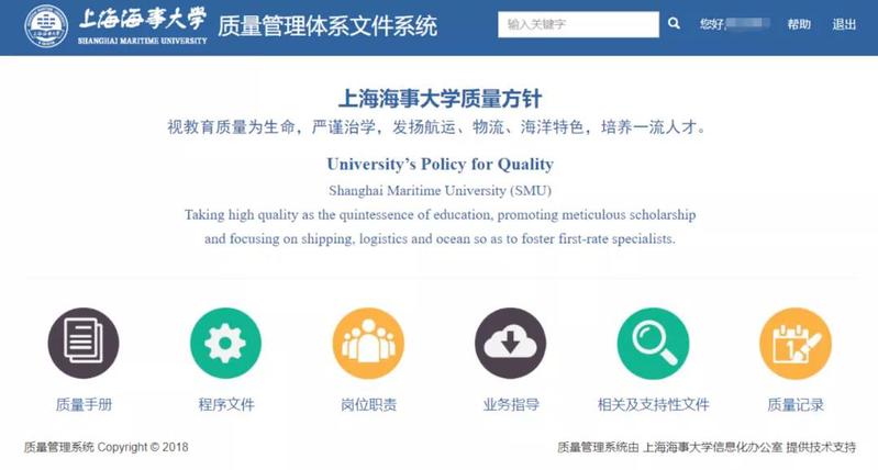 上海海事大学质量管理体系文件繁多, 总体分为质量手册、程序文件、相关及支持性文件、质量记录、岗位职责等类型,主要由全校各部门经审核流程提交后,由质量管理办公室进行管理,所有文件经授权发布,供校内师生查阅。