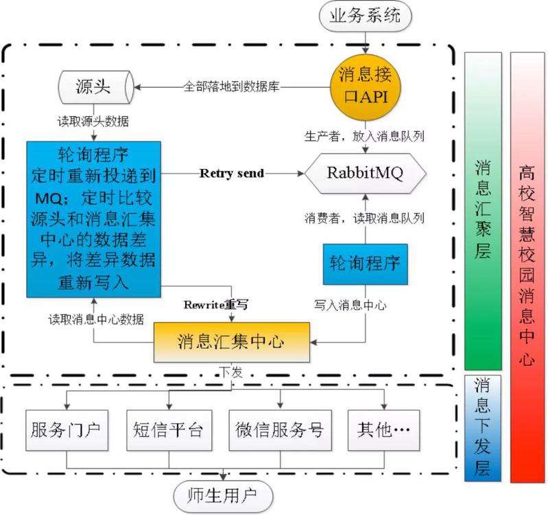 基于RabbitMQ的智慧校园消息中心包括:“消息汇聚层”和“消息下发层”,消息汇聚层完成业务消息的统一汇集与存储,消息下发层则以方便、有效的途径(服务门户、短信消息、微信消息等)将消息下发给师生用户。具体架构如图2所示。