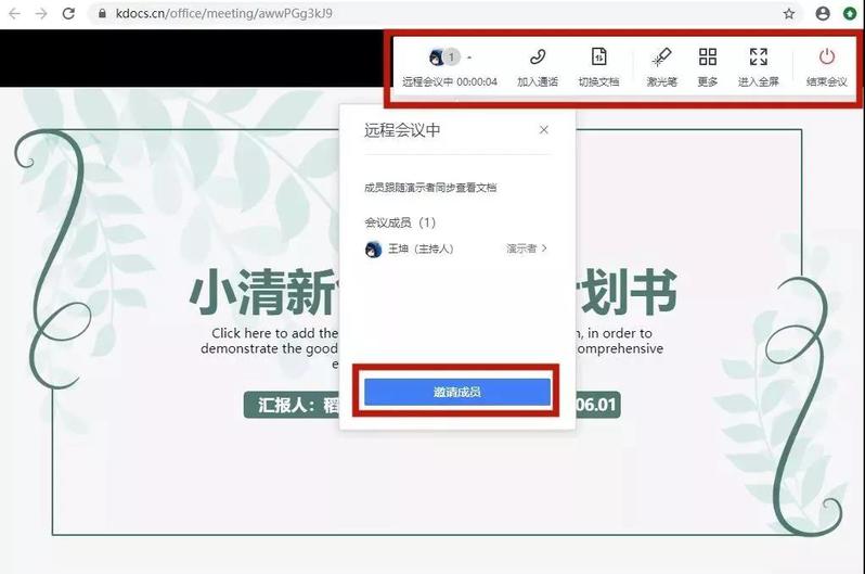 用金山文档点击进入会议模式后,选择【邀请成员】,然后可以通过二维码或者复制链接邀请需要参加本次会议的人进来,手机还是电脑都可以参加会议。