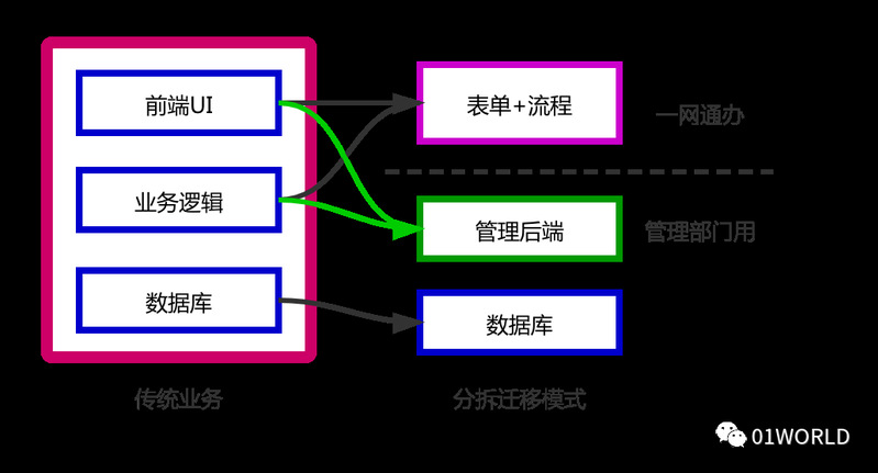 对于部分传统的小型业务系统,功能主要是数据的增删,或者是审批流程类的业务,完全可以基于流程引擎重新改造。譬如原有OA中的签报、发文等审批类业务,不需要再单独做一个系统,只需要在“一网”中借助于流程引擎重新实现即可。这种模式如图2所示,原有的“前端UI”和“业务逻辑”合并整合到“一网”中。