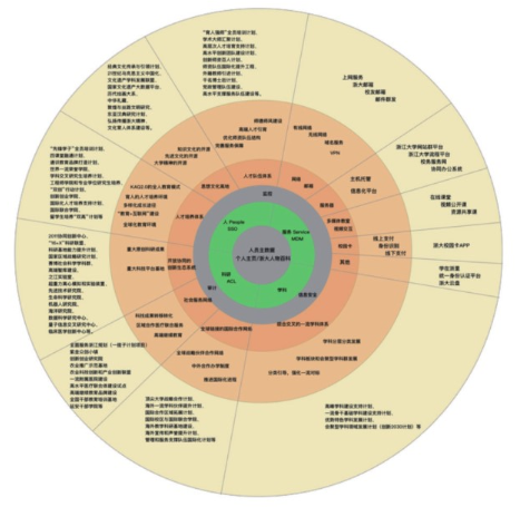 图中圆心部分是人员主数据,向外展开后,网上浙大的数据将涵盖学校业务的四个方面,人才、科研、教学和管理。从图中可以看出,教学部分占学校主要业务的1/4,包括在网络平台上的移动学习等,在这当中我们将智慧教室、课程等内容与知识图谱进行了关联。