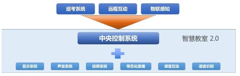 我们把上述场景固化成智慧教室的建设标准,并命名为1+x,如图2所示。1是以下这七块:显示系统、声音系统、投屏系统、直录播系统、课堂互动系统及语音识别系统,最终通过中控系统对其进行管理,向上有三个可选系统:巡考系统、远程互动系统、物联感知系统,这样就形成了7+3共10个内容。