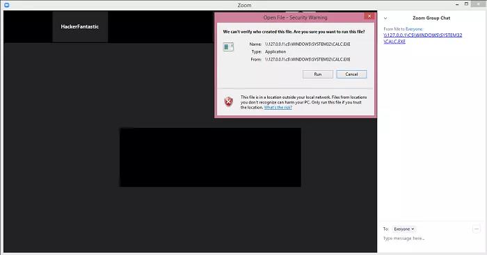 庆幸的是,Windows 会在程序被执行前发出是否允许其运行的提示。想要堵上这一漏洞,Zoom 必须阻止 Windows 客户端的 UNC 路径转换功能(屏蔽部分可点击的超链接)。