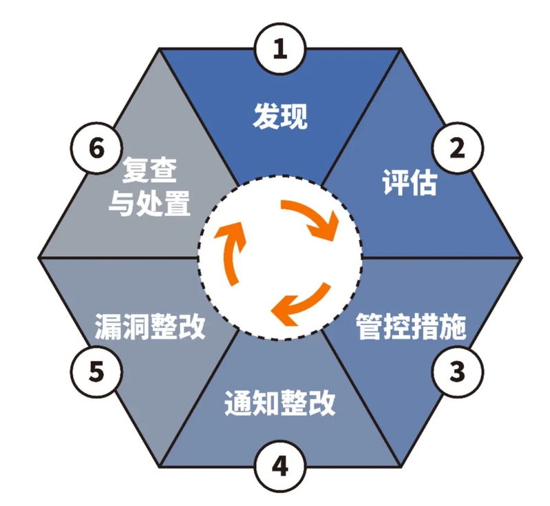 按照漏泄处理的过程,我们把信息系统的漏洞管理分为6个环节,分别是漏洞发现、评估、对漏洞所在信息系统采取管控措施、通知整改、漏洞整改、漏洞复查和处置,称之为信息系统漏洞的闭环管理,如图1所示。