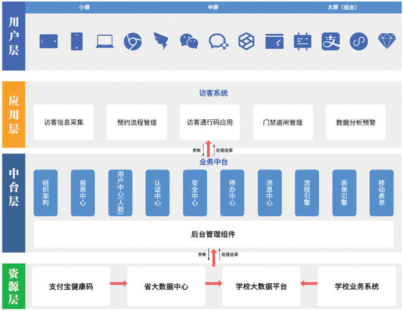 网络层为客户端层与服务层、数据访问层与业务逻辑层的交互提供数据传输通道,涵盖了每个学校进出校门的服务器层访问权限,数据下发和客户端层访客的进出访问数据信息上传、客户端层校园通行二维码数据校验等所有数据信息上传下载的通道,支持客户端层和服务器层以局域网或互联网等多种方式实现数据交互。