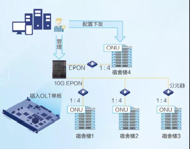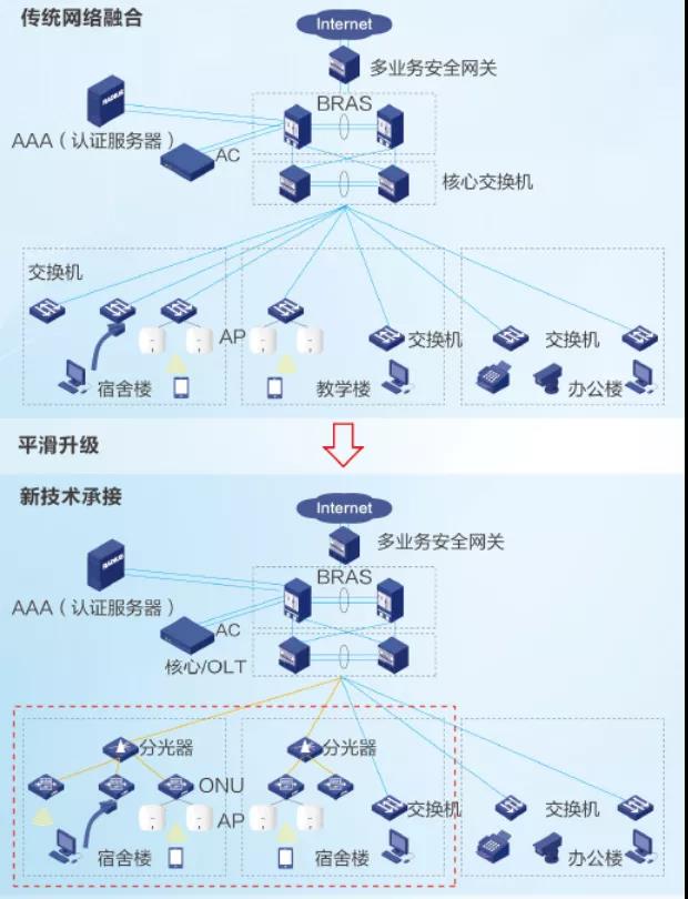 如何在高速网络的正常供应的前提下,进一步实现有效的运维,并为智慧校园的建设做好基础保障?新华三集团在南京邮电大学部署的二层架构解决了这一问题。二层架构由BRAS设备旁挂至核心交换机和OLT设备上行连接核心交换机组成,实现了无多层汇聚的简洁架构。各分光器在楼宇弱电间外使用壁挂式墙柜,并引出皮缆光纤连接各房间内多媒体箱中的ONU。通过对交换机和OLT的统一管理,不仅解决了校园环境分支复杂的难题,还为学校降低了高昂的自建环境维护成本,同时采用无源的分光设备,也消除了弱电间用电设备导致的火险隐患。