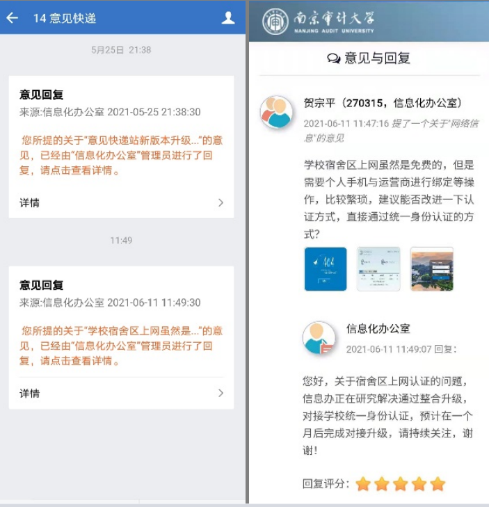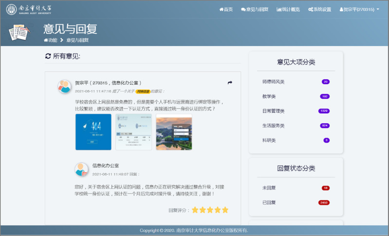 南京审计大学深刻认识到如果脱离了有效的管理机制,功能再强大的信息系统也无法充分发挥作用。“师生意见快递站”系统部署上线后,学校机关党委立即发文提出工作要求,明确所有师生意见实行“首问负责制”,明确每类问题的第一责任人,并要求做到“第一时间响应”、“意见当天回复”。
