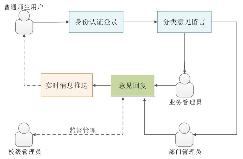 一是普通师生用户角色,普通师生用户是意见建议投递的主体,能够查看浏览自己个人发表投递的意见建议和相关回复,并能够对回复情况进行评分;