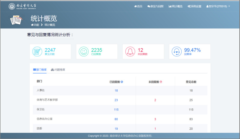 在其党政办、纪委等部门的合力监督管理下,系统以良好的交互设计,取得了优异的应用效果和用户评价,部署上线运行3个月的时间,已累计收到2247条意见建议,意见回复率达到99.5%。