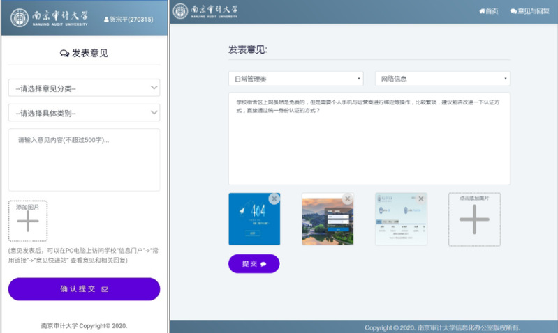 在交互设计上,借鉴微博、微信朋友圈的社交意见平台的有益理念,允许用户发表文字和照片作为意见建议内容,界面设计简洁,系统交互贴近用户、容易上手。广大师生能够对回复情况进行点评打分,促进业务管理部门更好的改进工作。