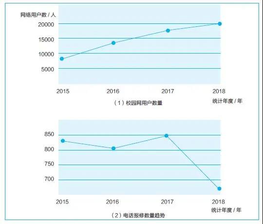 2018年,学校开始按照上述体系系统培养网信协理员。图6显示了2015~2018年度具体的电话报修次数和校园网用户受惠层面。