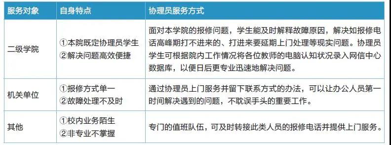 新型“网信协理员”运行模式是基于传统网络维护模式,经多年经验总结,改进升级形成,其最大的特点就是把重复、繁冗的信息咨询性“报修电话”消弭于无形,如“网线没插紧”“换房间要做变更”等简单上手就能解决的“故障”,不再需要网信中心的学生上门服务。一般咨询电话中出现的故障交由时间相对充裕的协理员完成,从而节省了工作人员的时间和精力,使其专注应对冗杂的维修故障,能在保质保量完成的基础上提高效率。