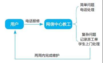 以大连工业大学网络信息中心(以下简称“网信中心”)为例,网信中心面向全校20000多名教师员工和本硕博学生设有23000多个信息点。作为校园必要的综合性运维体系,每年教学时段受理报修电话800余次,月均报修量近百,校园网络整体规划分工简略,技术人员有限,用户问题庞杂。自2001年全面铺设网络设施以来,大连工业大学的网络报修流程20年来基本未发生变化,师生日益增长的用网需求与目前的团队架构及解决方式之间失衡严重。