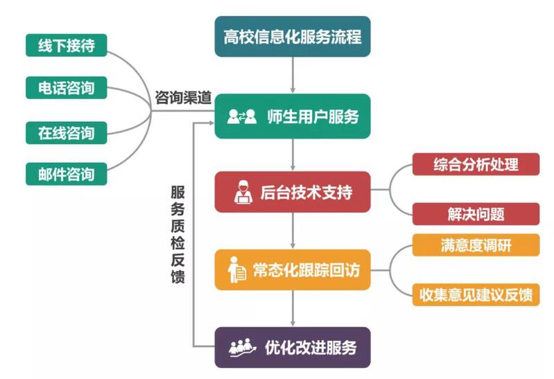 从前期调研师生需求,到信息化服务应用系统不断改造升级,再到后期对师生问题悉心回访,全年跟踪服务动态,构成全链条高校信息化服务闭环。