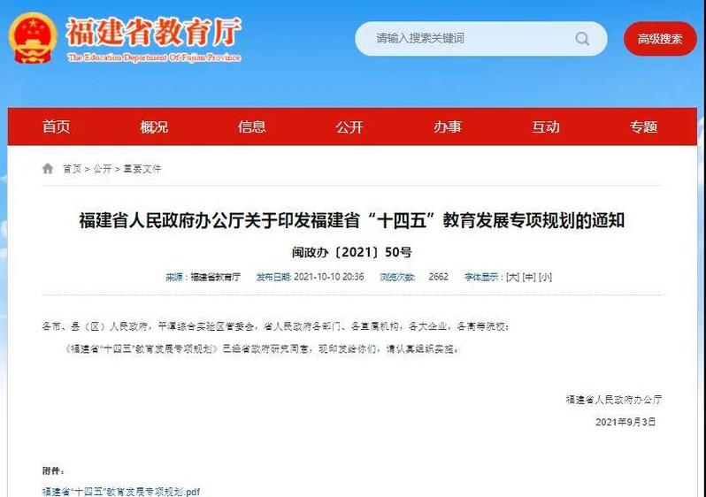 日前,福建省人民政府办公厅印发《福建省“十四五”教育发展专项规划》,提出到2025年,福建省基本建成高质量教育体系,各级各类教育总体发展水平进入东部中等行列,教育现代化水平显著提升。