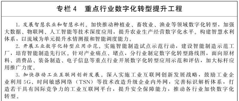 ——产业数字化转型迈上新台阶。农业数字化转型快速推进,制造业数字化、网络化、智能化更加深入,生产性服务业融合发展加速普及,生活性服务业多元化拓展显著加快,产业数字化转型的支撑服务体系基本完备,在数字化转型过程中推进绿色发展。