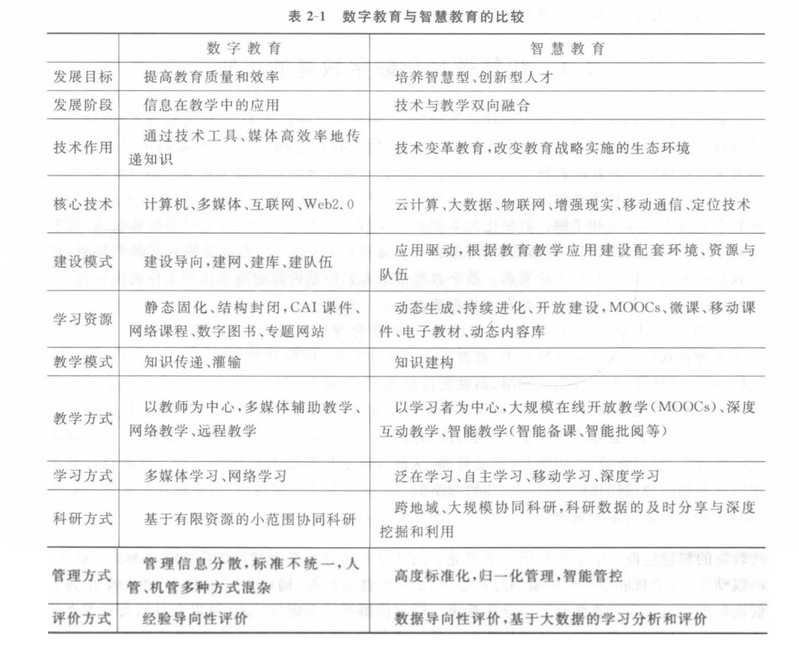 智慧教育在发展目标、发展阶段、技术作用、核心技术、建设模式、学习资源、教学模式、教学方式、学习方式、科研方式、管理方式、评价方式等方面与传统数字教育表现出诸多的不同(见表2-1),总体呈现智能化、融合化、泛在化、个性化与开放协同的特征与发展趋势。
