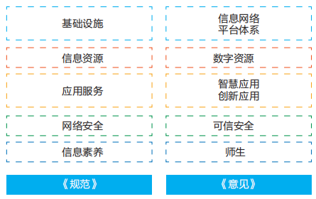 我们可以看到,《关于推进教育新型基础设施建设构建高质量教育支撑体系的指导意见》(以下简称“《意见》”)中所要求的新网络、新平台、新安全、新资源、新校园、新应用六个方面,与《规范》中提到的包括基础设施、信息资源、应用服务、网络安全、保障体系,基本一脉相承(如图1所示)。
