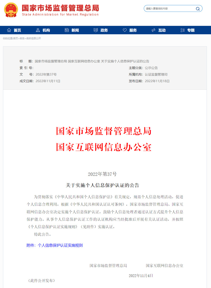 据国家市场监督管理总局官网公告,近日,国家市场监督管理总局、国家互联网信息办公室决定实施个人信息保护认证,鼓励个人信息处理者通过认证方式提升个人信息保护能力。从事个人信息保护认证工作的认证机构应当经批准后开展有关认证活动,并按照《个人信息保护认证实施规则》(以下简称《规则》)实施认证。