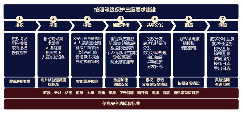 通过授权、采集、核验、存储、分发、销毁、溯源7大数据生命周期管理,使人脸数据的使用具备合法合规性,提升了系统安全性,保护了人脸数据和个人信息。