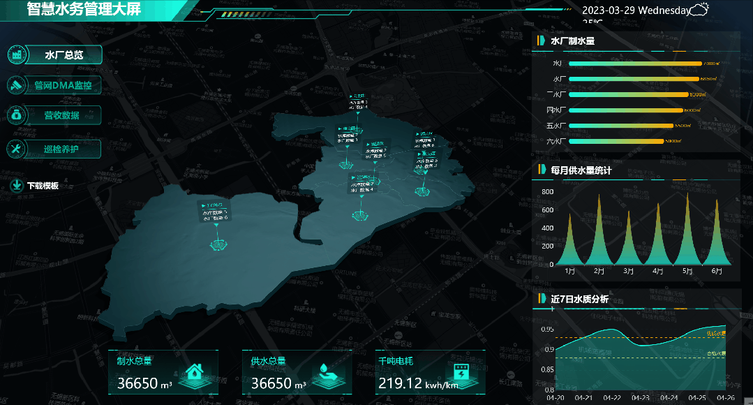 以下是FineVis制作的智慧水务数字孪生大屏,在管线铺设前可以用来模拟铺设和运行情况,在管线铺设后可以连接数据进行异常数据的实时预警。